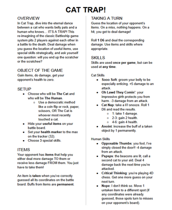 In Cat Trap, dive into the eternal dance between a cat who wants belly pats and a human who knows… IT’S A TRAP! This re-imagining of the classic Battleship game system pits 2 players against each other in a battle to the death. Deal damage when you guess the location of useful items, use special skills strategically, and ask yourself one question: will you end up the scratcher or the scratchee?